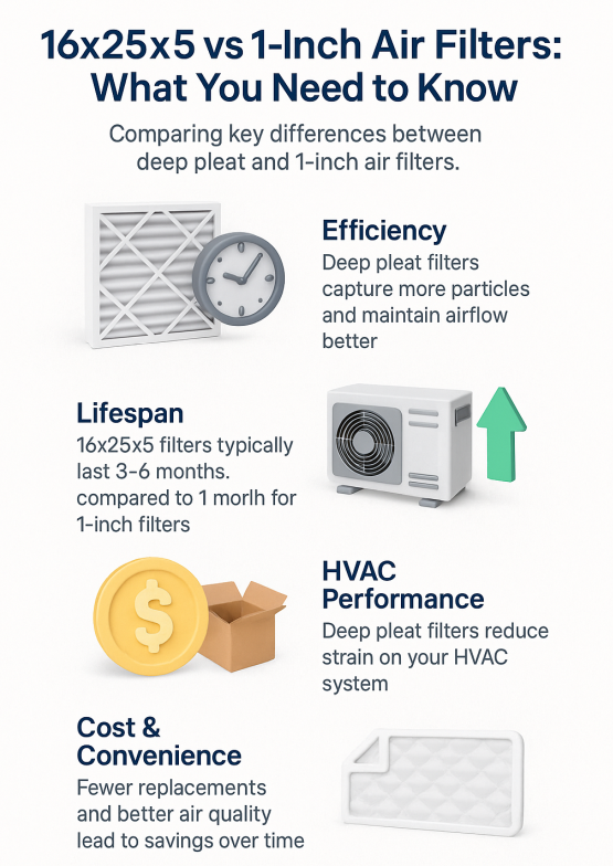 A 16x25x5 deep pleat filter has more surface area, which means it traps more dust, pollen, and allergens without clogging as quickly. A 1-inch filter clogs faster and typically needs to be replaced every 30 days, while the deep pleat lasts 3–6 months.