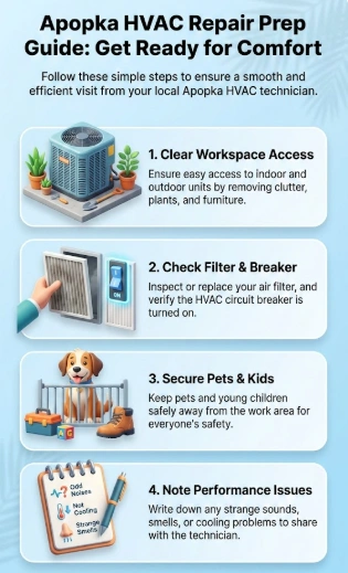 This guide shares the specific prep steps that experienced HVAC repair professionals in Apopka actually want you to take before they arrive—practical actions that make their job easier and your repair bill lighter.